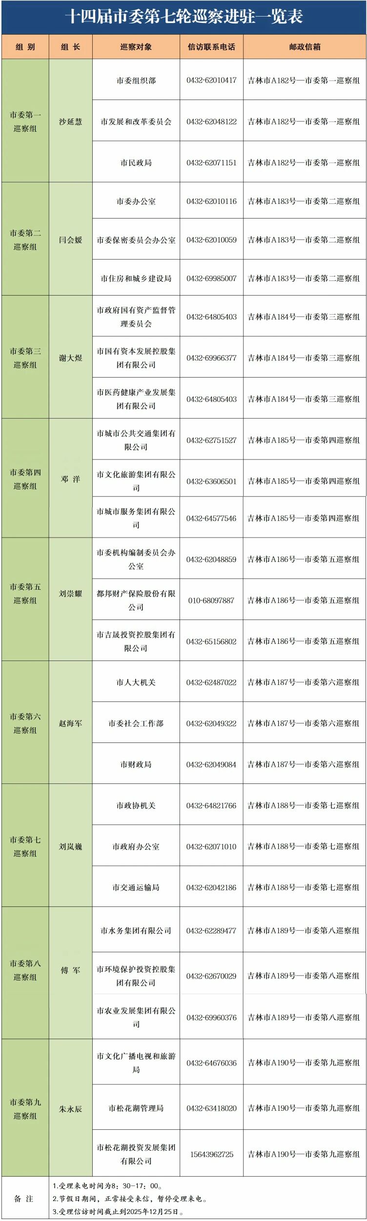 据悉,各巡察组将在被巡察部门(单位)工作2个半月左右,期间设立信访联系电话和邮政信箱,主要受理反映被巡察党组织领导班子及其成员、下一级党组织主要负责人和重点岗位人员问题的来信来电来访,重点是关于违反政治纪律、组织纪律、廉洁纪律、群众纪律、工作纪律和生活纪律等方面问题反映。巡察组受理信访时间截止到2025年12月25日。