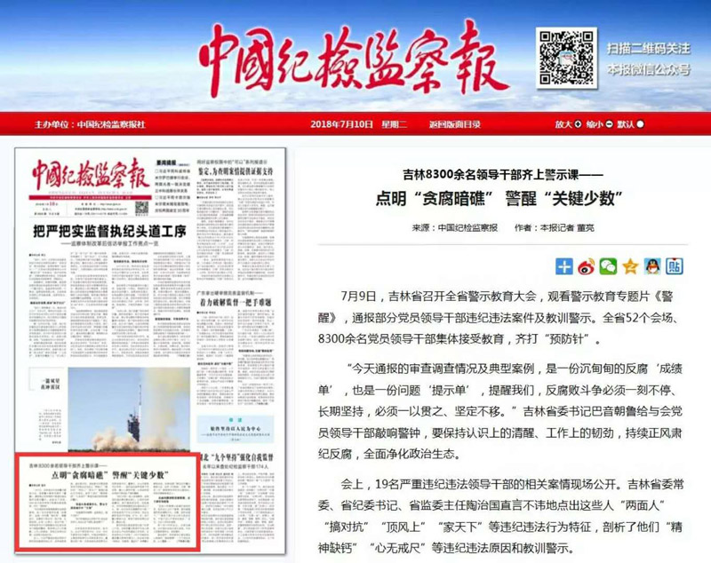 据吉林省纪委监委相关部门负责人介绍,该省把警示教育作为深入推进全面从严治党的基础工作来抓,去年省委办公厅印发了《关于加强党风廉政警示教育的意见》,在全省开展“讲政治、知敬畏、重品行”专题警示教育活动。各地各部门通过召开警示教育大会、运用《忏悔录》、开展“廉政一日”教育等多种形式以案说纪,用身边事教育身边人。